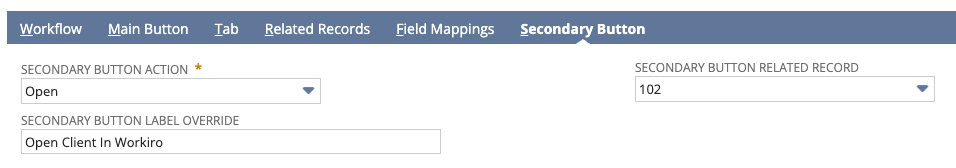 To configure how the Workiro button acts on the NetSuite record select the 'Main Button' Tab and configure the properties.